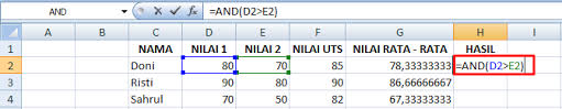 Rumus AND ini terdapat fungsi yang utama adalah Menghasilkan nilai TRUE jika semua argumen yang di uji tersebut bernilai BENAR dan FALSE jika semua atau salah satu argumen bernilai SALAH. Caranya kamu harus membuat tabel dan masukkan rumus AND untuk mengetahui TRUE atau FALSE. Misalnya =AND(D2>G2), atau seperti gambar di bawah ini: