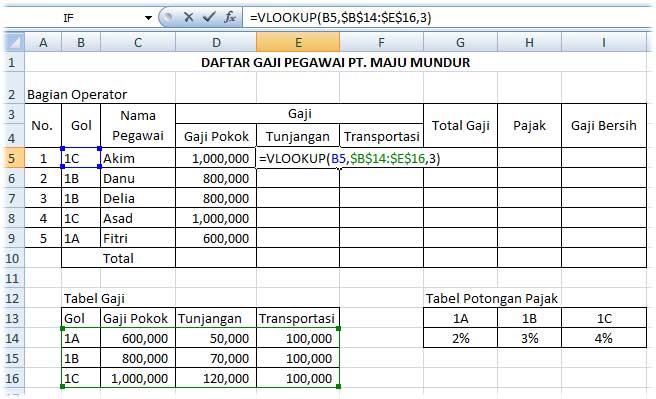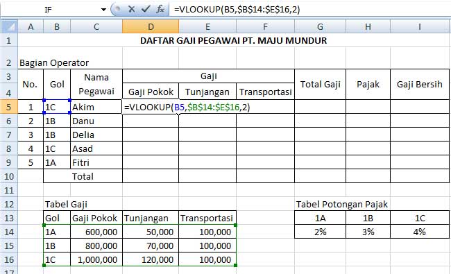 Untuk menghitung gaji pokok gunakan fungsi vlookup di sel D5. Setelah mengisi formula disel D5, copy formula atau drag hingga sel D9. Bentuk penulisan fungsinya sama dengan yang telah dijelaskan sebelumnya, yaitu, =VLOOKUP(lookup_value, table_array, col_index_num).