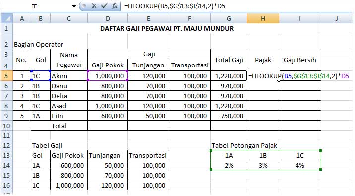 Untuk menghitung pajak gunakan fungsi HLOOKUP di sel H5, copy formula atau drag hingga sel H9. Seperti gambar di bawah ini.