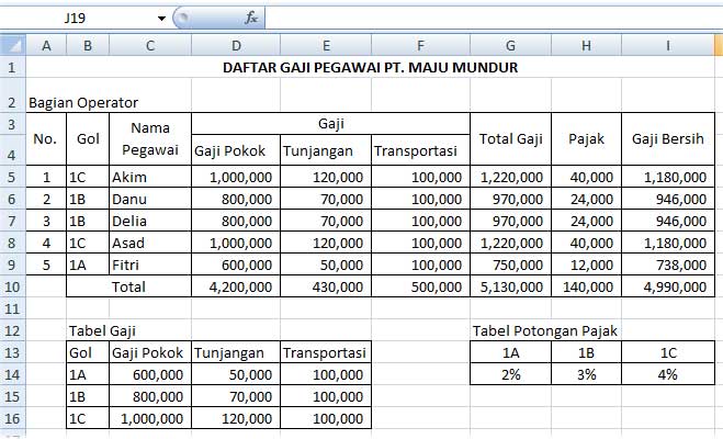 Melihat contoh soal di atas, yang harus anda isikan adalah menghitung gaji pokok, tunjangan, transportasi, total gaji, pajak, gaji bersih dan total.